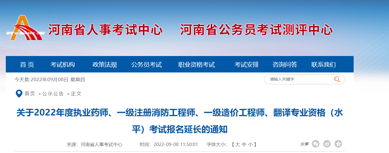 關于2022年度執(zhí)業(yè)藥師、一級注冊消防工程師、一級造價工程師、翻譯專業(yè)資格(水平)考試報名延長的通知