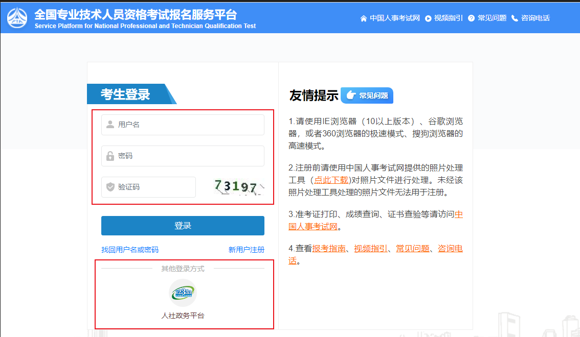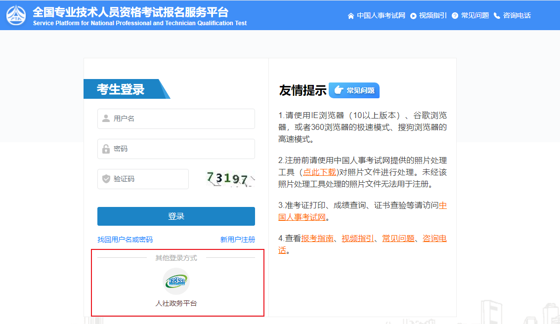 二、進(jìn)入到報(bào)名界面,報(bào)名界面樣式做出優(yōu)化,并新增“人社政務(wù)平臺(tái)”登錄方式,小編試過了,在新平臺(tái)報(bào)名需要注冊(cè)新賬號(hào)哦!