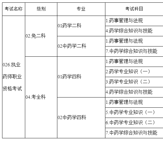 藥學(xué)類(lèi)考試科目:“藥學(xué)專(zhuān)業(yè)知識(shí)(一)”“藥學(xué)專(zhuān)業(yè)知識(shí)(二)”“藥事管理與法規(guī)”“藥學(xué)綜合知識(shí)與技能”。