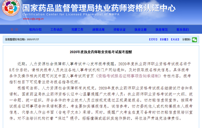 國家藥品監(jiān)督管理局發(fā)布2020年執(zhí)業(yè)藥師考試報(bào)考提醒!