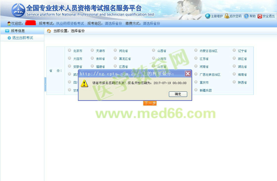根據(jù)中國人事考試網(wǎng)(http://www.cpta.com.cn/)網(wǎng)上報名入口顯示,北京市2017年執(zhí)業(yè)藥師考試報名入口開通時間為7月19日,希望北京考生不要錯過報名時間。