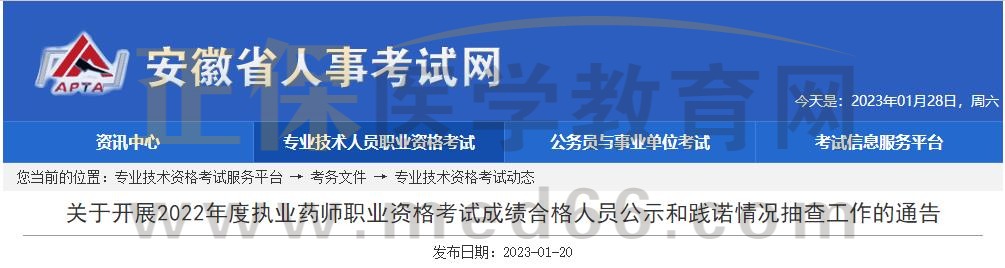 安徽省關(guān)于開(kāi)展2022年度執(zhí)業(yè)藥師職業(yè)資格考試成績(jī)合格人員公示和踐諾情況抽查工作的通告