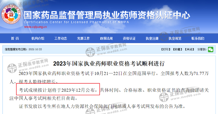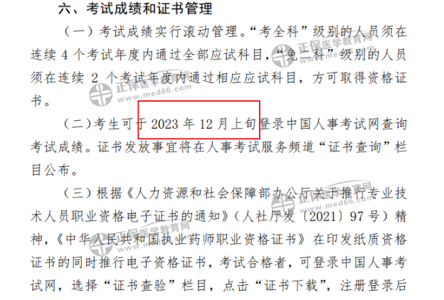 2023年執(zhí)業(yè)藥師報(bào)考通知關(guān)于成績(jī)查詢時(shí)間的截圖: