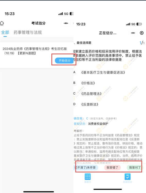 進(jìn)入“正保官方小助手”小程序后,在頂部進(jìn)入“2025年職業(yè)藥師考后估分入口”,選擇對應(yīng)考試科目,比如“藥事管理與法規(guī)”,根據(jù)自己考試的真實你的實際考試情況,選擇“我答對了”或“我答錯了”,如不是自己考試的試題則選擇“記不清了/未作答”。