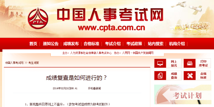 2、 復(fù)查程序。如對考試成績有異議,考生在成績公布后30日內(nèi)向當?shù)乜荚嚈C構(gòu)提交書面復(fù)查申請,各地人事考試機構(gòu)匯總后報人社部考試中心,人社部考試中心匯總后交有關(guān)部門進行成績復(fù)核,復(fù)核結(jié)果由各地人事考試機構(gòu)反饋考生。