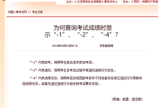 “-4”代表成績無效,說明考后發(fā)現(xiàn)因報(bào)考條件不符或者存在其它違紀(jì)行為導(dǎo)致科目成績無效,或雖無違紀(jì)違規(guī)行為但未按考試要求作答。