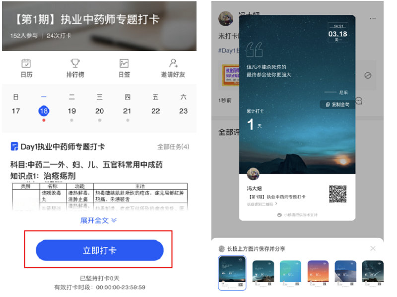 學(xué)習(xí)打卡后,點擊“立即打卡”,立即彈出打卡海報,保存分享到朋友圈。