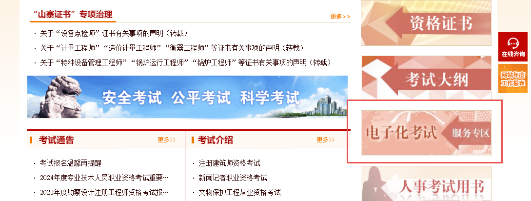 1、登錄 中國人事考試網(wǎng)> ,點(diǎn)擊“電子化考試服務(wù)專區(qū)”
