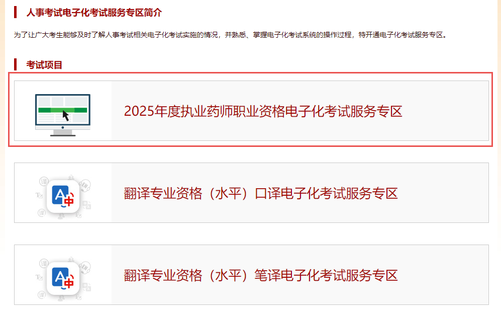 2、點(diǎn)擊“2025年度執(zhí)業(yè)藥師職業(yè)資格電子化考試服務(wù)專區(qū)”