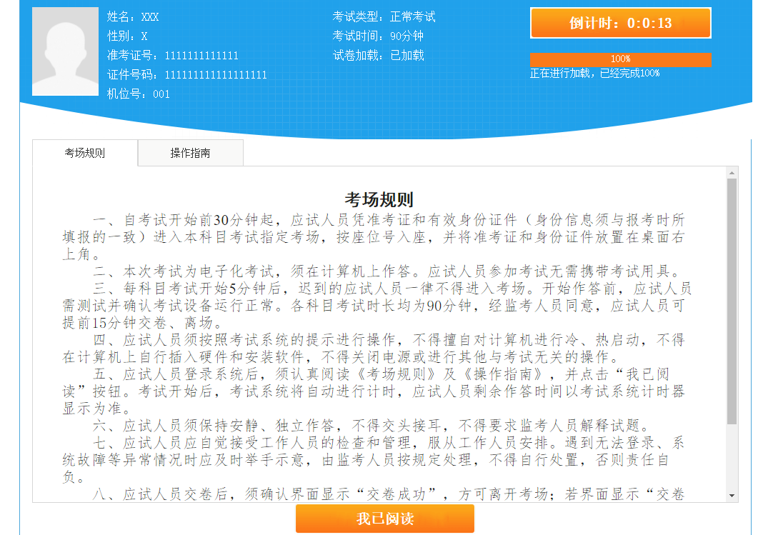 只有點(diǎn)擊“我已閱讀”按鈕后,應(yīng)試人員才能進(jìn)入作答界面。 考試開始時間到達(dá)后,計(jì)時器開始倒計(jì)時,請及時點(diǎn)擊“我已閱讀”按鈕,避免影響作答時間。