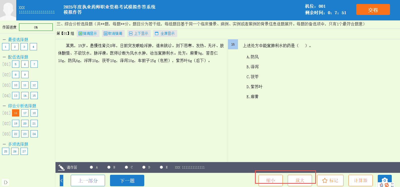在配伍選擇題與綜合分析選擇題界面中,試題欄默認(rèn)左右分欄,可以切換上下顯示、全屏顯示。