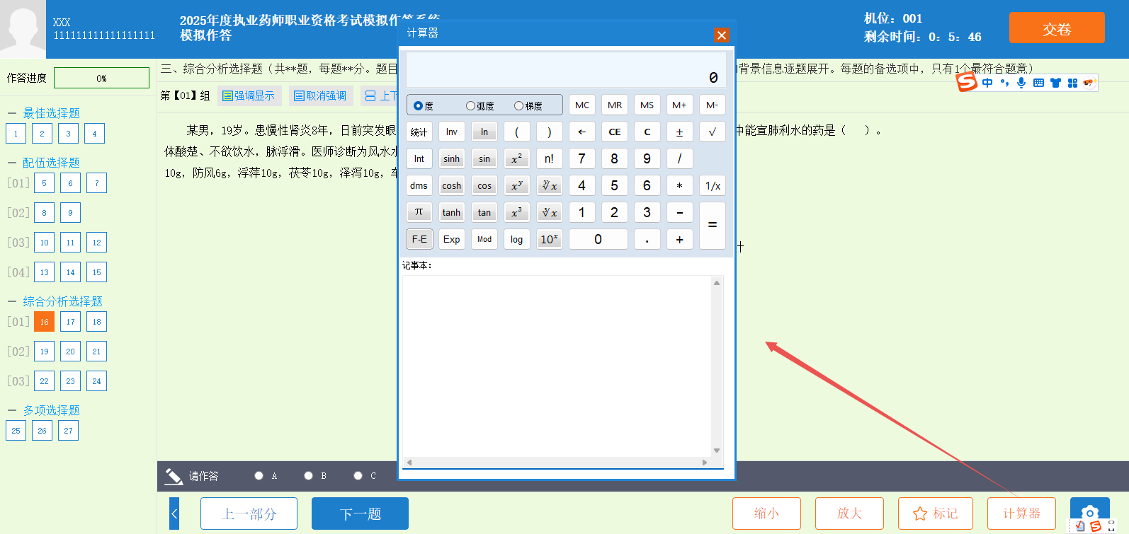 機(jī)考系統(tǒng)內(nèi)置計(jì)算器功能,操作方法與Windows系統(tǒng)自帶的計(jì)算器類似。應(yīng)試人員可以根據(jù)自身需要,在計(jì)算器界面下方的記事本區(qū)域輸入文字或字符,其功用相當(dāng)于“電子草稿紙”;使用鍵盤中的Ctrl+Shift組合鍵可以切換輸入法。