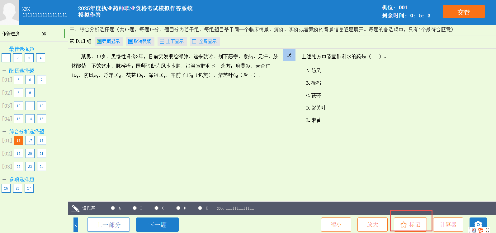 機(jī)考系統(tǒng)提供標(biāo)記題號功能,點(diǎn)擊試題欄底部的“標(biāo)記”按鈕可標(biāo)記當(dāng)前試題題號。