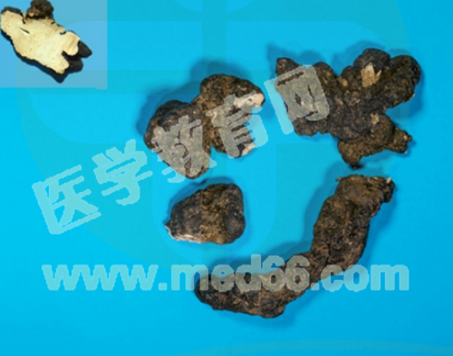 藥材呈條形、類圓形或扁塊狀,表面黑色、灰黑色或棕黑色,皺縮或有瘤狀突起。體輕,質硬,斷面類白色或黃白色,略呈顆粒狀。