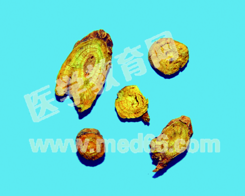 圓錐形。表面棕黃色或深黃色,有稀疏的疣狀細(xì)根痕。質(zhì)硬而脆,易折斷,斷面黃色,中心紅棕色;老根中心呈枯朽狀或中空,暗棕色或棕黑色,氣微,味苦。