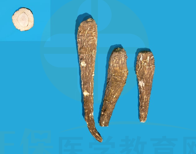 呈長(zhǎng)圓錐形。頂端有凹陷的莖痕,根頭部鈍四棱形或近圓形;表面灰黃色至黃棕色,具縱皺紋、支根痕及皮孔樣橫向突起,習(xí)稱“疙瘩丁”,散生或排列成四縱行。質(zhì)堅(jiān)實(shí),斷面白色或灰白色,粉性,形成層環(huán)棕色,近方形或近圓形,皮部散有多數(shù)棕色油點(diǎn),氣芳香,味辛、微苦。