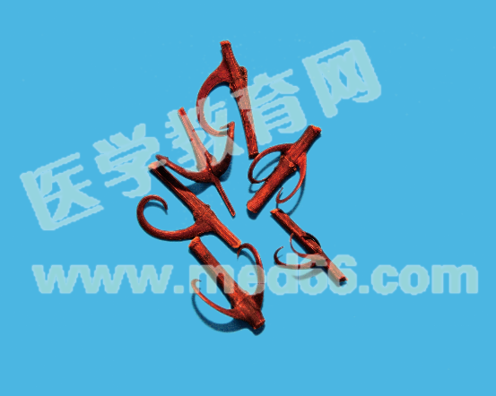 為帶單鉤或雙鉤的莖枝小段。莖枝表面紅棕色至紫紅色者,具細(xì)縱紋,光滑無(wú)毛;黃綠色至灰褐色者有的可見(jiàn)白色點(diǎn)狀皮孔,被黃褐色柔毛。多數(shù)枝節(jié)上對(duì)生兩個(gè)向下彎曲的鉤(不育花序梗),或僅一側(cè)有鉤,另一側(cè)為突起的疤痕;鉤略扁或稍圓,先端細(xì)尖,基部較闊:鉤基部的枝上可見(jiàn)葉柄脫落后的窩點(diǎn)狀痕跡和環(huán)狀托葉痕。質(zhì)堅(jiān)韌,斷面黃棕色,皮部纖維性,髓部黃白色或中空,氣微,味淡。