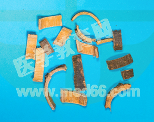 【性狀鑒別】呈彎曲的絲或塊片狀。外表面灰棕色至灰褐色,密生明顯的橢圓形橫向皮孔,棕色或棕紅色。內(nèi)表面淡黃棕色或黃白色。氣微香,味淡、微澀、稍刺舌,而后喉頭有不適感。