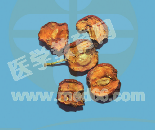 藥材為圓形片,皺縮不平,外皮紅色,具皺紋,有灰白小斑點(diǎn)。氣微清香,果肉深黃色至淺棕色。味酸、微甜。