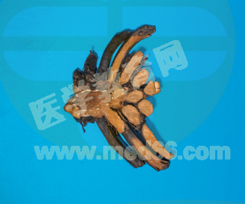【性狀鑒別】呈不規(guī)則厚片或碎塊,根莖外表面黃棕色至黑褐色,多被有葉柄殘基,切面淡棕色至紅棕色,有黃白色維管束小點(diǎn),環(huán)狀排列。