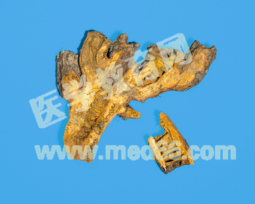 藥材多為圓柱形短段或不規(guī)則厚片。外皮棕褐色,有縱皺紋及須根痕,切面皮部較薄,木部寬廣,棕黃色,射線呈放射狀,皮部與木部較易分離。根莖髓中有隔或呈空洞狀。質(zhì)堅(jiān)硬。氣微,味微苦、澀。