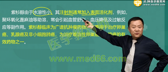 考點2:關(guān)于紫杉醇的說法錯誤的是: 紫杉醇的水溶性大其注射劑通常加入聚氧乙烯麻油等表面活性劑