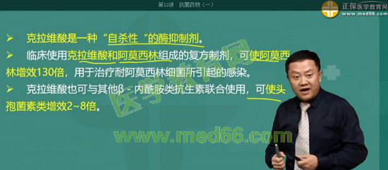 考點4:關(guān)于克拉維酸的說法錯誤的是: 克拉維酸可單獨用于治療耐阿莫西林細菌所引起的感染