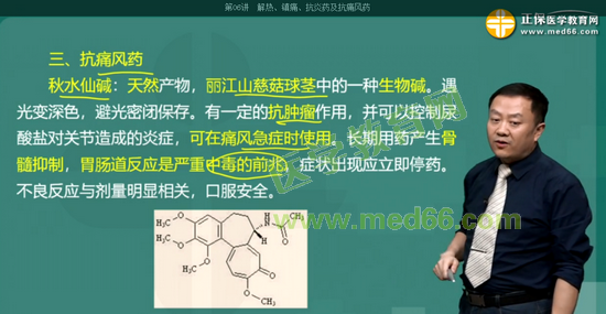 考點32:從百合科植物麗江山慈菇的球莖中得到的種生物堿,能抑制細胞有絲分裂,有一定的抗腫瘤作用,可以控制尿酸鹽對關(guān)節(jié)造成的炎癥,可在痛風急癥時使用的藥物是: 秋水仙堿