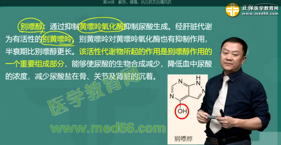 考點33:通過抑制黃嘌呤氧化酶而抑制尿酸的生成,在肝臟中可代謝為有活性的別黃嘌哈的藥物是: 別嘌醇