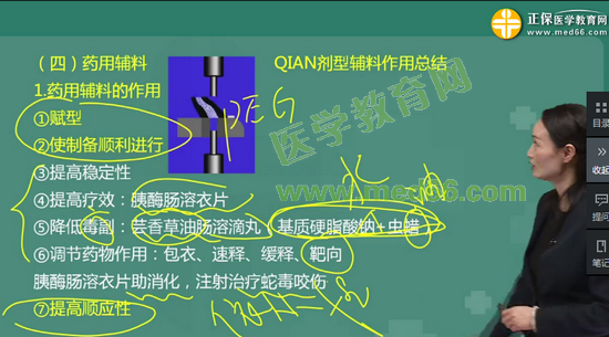 考點38:藥用輔料的作用有:使制劑成型;使制備過程順利進行;降低藥物毒副作用;提高藥物療效;提高藥物穩(wěn)定性