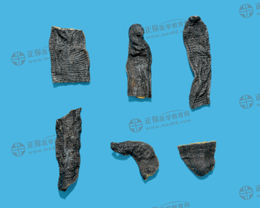 螞蟥:為扁平紡錘形,有多數(shù)環(huán)節(jié)。背部黑褐色或黑棕色,稍隆起,用水浸后,可見黑色斑點(diǎn)排成5條縱紋;腹面平坦,棕黃色;兩側(cè)棕黃色。前端略尖,后端鈍圓。兩端各具一吸盤,前吸盤不顯著,后吸盤較大。質(zhì)脆,易折斷,斷面膠質(zhì)狀。氣微腥。