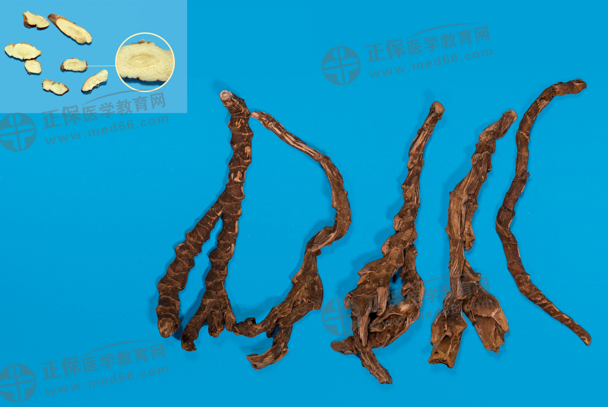 藥材呈圓柱形,略彎曲,表面灰黃色至灰棕色,有較密并深陷的橫皺紋、縱皺紋及裂紋。質(zhì)硬而脆,易折斷,斷面皮部棕黃色,皮部易與木部剝離。氣微,味苦、微辛,嚼之有刺喉感。