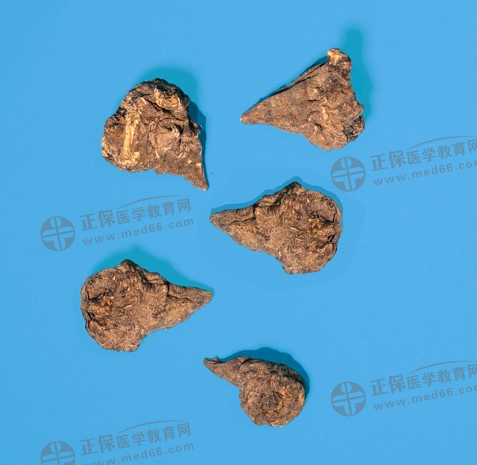 呈不規(guī)則圓錐形,稍彎曲,頂端常有殘莖,中部多向一側(cè)膨大。表面棕褐色或灰棕色,皺縮,有小瘤狀側(cè)根及子根脫離后的痕跡。質(zhì)堅(jiān)實(shí),斷面類白色或淺灰黃色,形成層環(huán)紋呈多角形。氣微,味辛辣、麻舌。