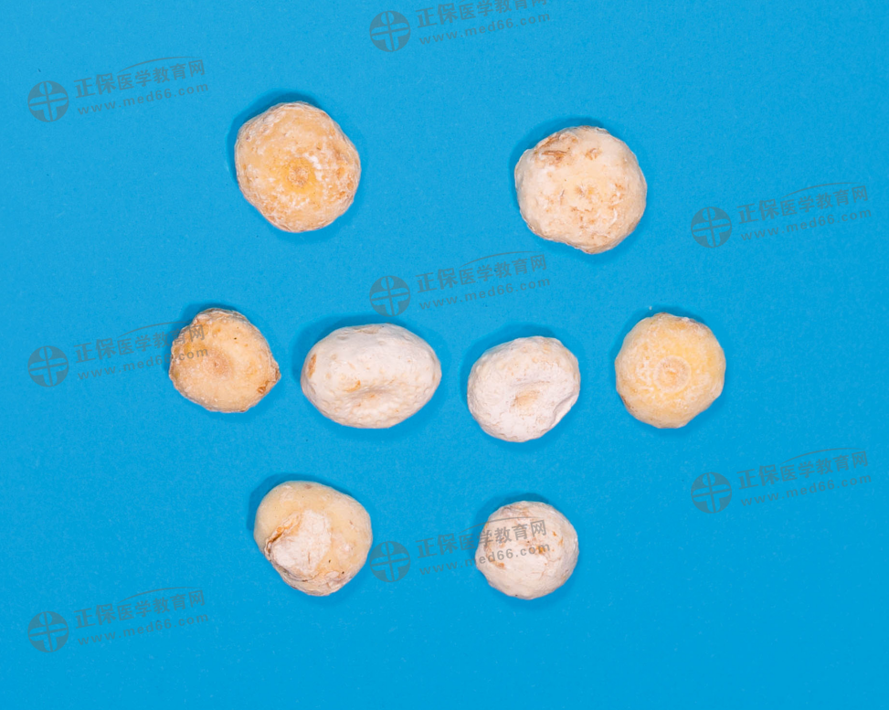 藥材呈類球形,有的稍偏斜,直徑0.7~1.6cm。表面白色或淺黃色,頂端有凹陷的莖痕,周圍密布麻點(diǎn)狀根痕;下面鈍圓,較光滑。質(zhì)堅(jiān)實(shí),斷面潔白,富粉性。氣微,味辛辣、麻舌而刺喉。
