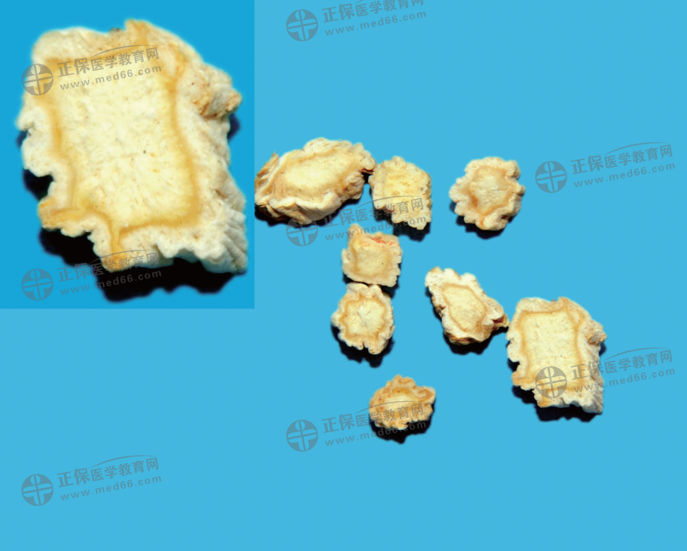 藥材呈圓柱形或略呈紡錘形,下部漸細(xì),有的有分枝,略扭曲。表面淡黃色至黃色,不去外皮的表面黃棕色至灰棕色,具縱扭皺溝,并有橫長(zhǎng)的皮孔樣斑痕及支根痕,上部有橫紋。有的頂端有較短的根莖或不明顯,其上有數(shù)個(gè)半月形莖痕。質(zhì)脆,斷面不平坦,橫切面可見(jiàn)放射狀裂隙,皮部黃白色,形成層環(huán)棕色,木部淡黃色。氣微,味微甜后苦。