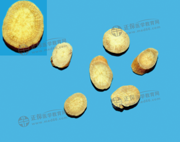 藥材呈圓柱形,表面類白色或淡紅棕色。質堅實,不易折斷,斷面較平坦,類白色或略帶棕紅色,形成層環(huán)明顯,射線放射狀。氣微,味微苦、酸。