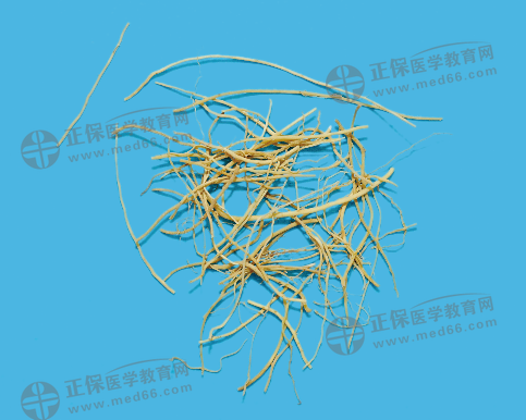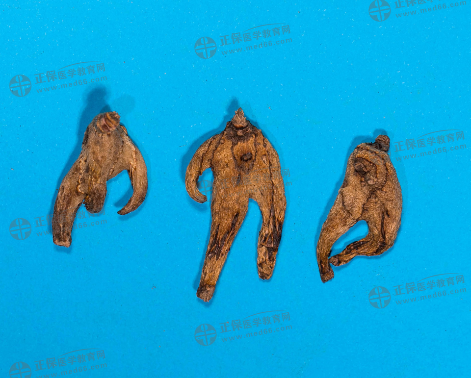 藥材呈不規(guī)則扁圓形,多有2~3個爪狀分枝,少數(shù)具4~5個爪狀分枝。表面灰白色至灰棕色,或黃白色,有數(shù)圈同心環(huán)節(jié)和棕色點(diǎn)狀須根痕,上面有突起的莖痕,下面有連接另一塊莖的痕跡。質(zhì)堅(jiān)硬,不易折斷,切面類白色,角質(zhì)樣。氣微,味苦,嚼之有黏性。