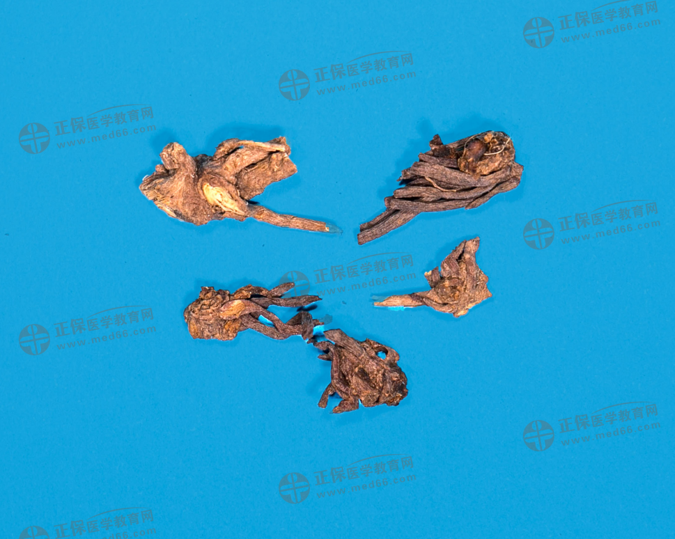 藥材根莖呈不規(guī)則塊狀,大小不一,頂端有莖、葉的殘基;質(zhì)稍硬。根莖簇生多數(shù)細(xì)根,多編成辮狀;表面紫紅色或灰紅色,有縱皺紋。質(zhì)較柔韌。氣微香,味甜、微苦。