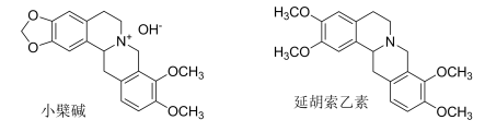 (2)小檗堿類和原小檗堿類:由兩個異喹啉環(huán)稠合而成,依據(jù)母核中 C 環(huán)氧化程度不同,分為小檗堿類和原小檗堿類,前者多為季銨堿,如小檗堿;后者多為叔胺堿,如延胡索乙素。