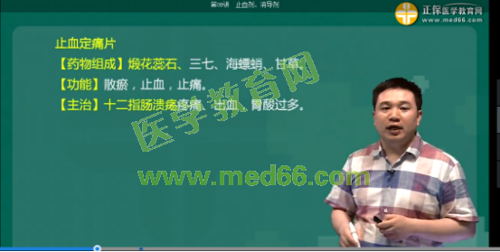 考點(diǎn)13、某醫(yī)師治十二指腸潰瘍疼痛,出血,易酸過多,用止血定痛片,此成藥的功能是散瘀、止血、止痛。