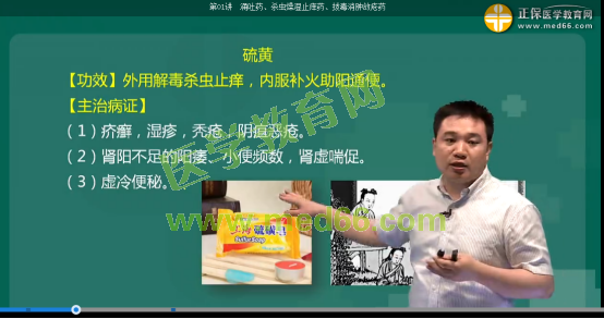 考點(diǎn)14、某男、60歲,患皮膚瘙癢3年,刻下全身遍布抓痕、結(jié)痂、黑色斑點(diǎn)、時起膿皰,自覺奇癢,搔抓不已,遇熱及夜間更甚,痛苦不堪,醫(yī)師診為疥瘡,準(zhǔn)備為其配制殺蟲止癢外用藥膏,宜選用的藥是硫黃。