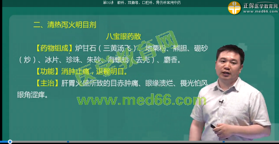考點(diǎn)25、治肝陽火盛所致的目赤腫痛、眼緣潰爛、畏光怕熱、眼角澀癢,某眼科醫(yī)師在給患者處以相應(yīng)的湯劑內(nèi)服外,常配以八寶眼藥散點(diǎn)眼,以增強(qiáng)療效。此因該成藥除消腫止痛外。又能退翳明目。