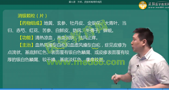 考點(diǎn)30、某女,50歲,患白疕15年,癥見皮疹為點(diǎn)滴狀,基底鮮紅色,表面覆有銀白色鱗屑,證屬血熱風(fēng)燥,皮膚科醫(yī)師建議服用消銀顆粒,此因該成藥除祛風(fēng)止癢外,又能養(yǎng)血潤膚。