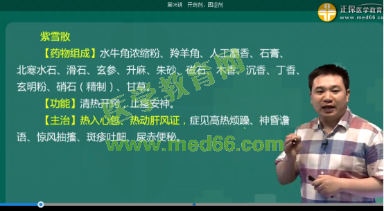 考點(diǎn)33、醫(yī)師治療熱入心包、熱動肝風(fēng)證時,常投紫雪散。此因該成藥除清熱開竅外,又能止痙安神。