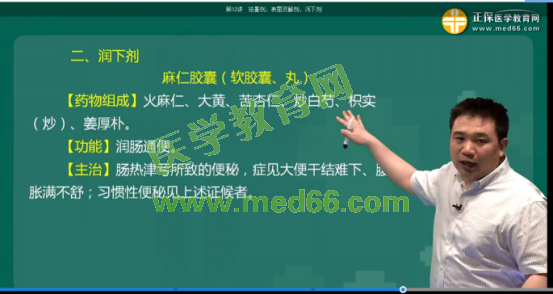 考點(diǎn)62、麻仁膠囊的主治病證是腸熱津虧所致的便秘;當(dāng)歸龍薈丸的主治病證是肝膽火旺所致的便秘。
