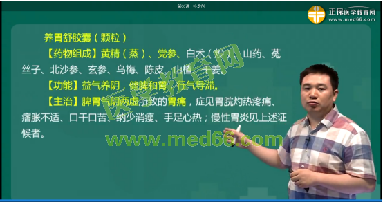 考點(diǎn)77、某男,30歲,患慢性胃炎數(shù)年,癥見胃脘灼熱痛,痞脹不適,口干口苦,納少消瘦,手足心熱,經(jīng)服養(yǎng)胃舒膠囊取效,因成藥功能有:益氣養(yǎng)陰,健脾和胃,行氣導(dǎo)滯。