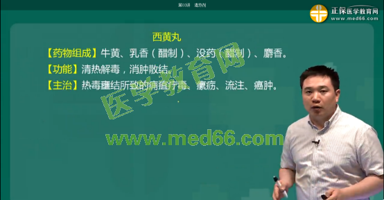 考點(diǎn)31、牛黃醒消丸與連翹敗毒丸功能相似,二者除同能清熱解毒、消腫止痛外,牛黃醒消丸還能活血祛瘀。