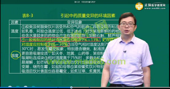 考點9.濕度是影響藥物質量的一個重要因素,不僅可引起藥物的物理和化學變化,如含水量,外觀形態(tài),化學成分發(fā)生改變等,而且能影響微生物的繁殖及害蟲的生長。一般中藥炮制品的質量控制和貯藏要求應是:絕對含水量應控制在7%~13%,貯存環(huán)境的相對濕度應控制在35%~75%.