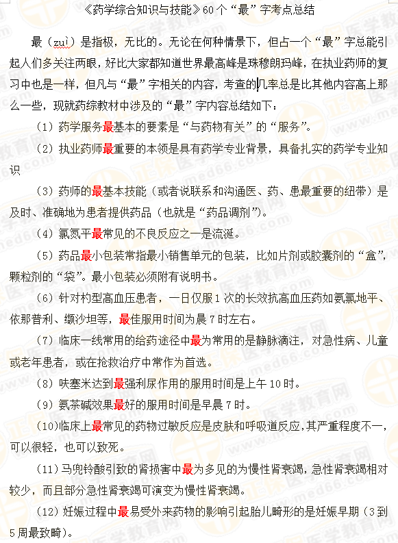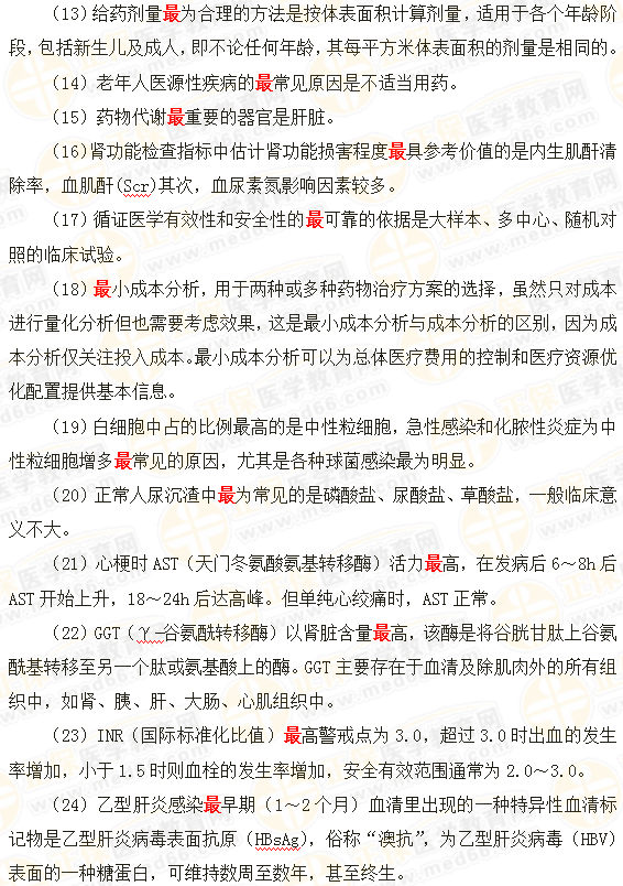 最(zuì)是指極,無比的。無論在何種情景下,但占一個(gè)“最”字總能引起人們多關(guān)注兩眼,好比大家都知道世界最高峰是珠穆朗瑪峰,在執(zhí)業(yè)藥師的復(fù)習(xí)中也是一樣,但凡與“最”字相關(guān)的內(nèi)容,考查的幾率總是比其他內(nèi)容高上那么一些,現(xiàn)就藥綜教材中涉及的“最”字內(nèi)容總結(jié)如下: