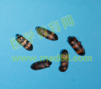 南方大斑蝥:呈長圓形,頭及口器向下垂,有較大的復(fù)眼及觸角各1對,觸角多已脫落。背部具革質(zhì)鞘翅1對,黑色,有3條黃色或棕黃色的橫紋;鞘翅下面有棕褐色薄膜狀透明的內(nèi)翅2片。胸腹部烏黑色,胸部有足3對。有特殊的臭氣。